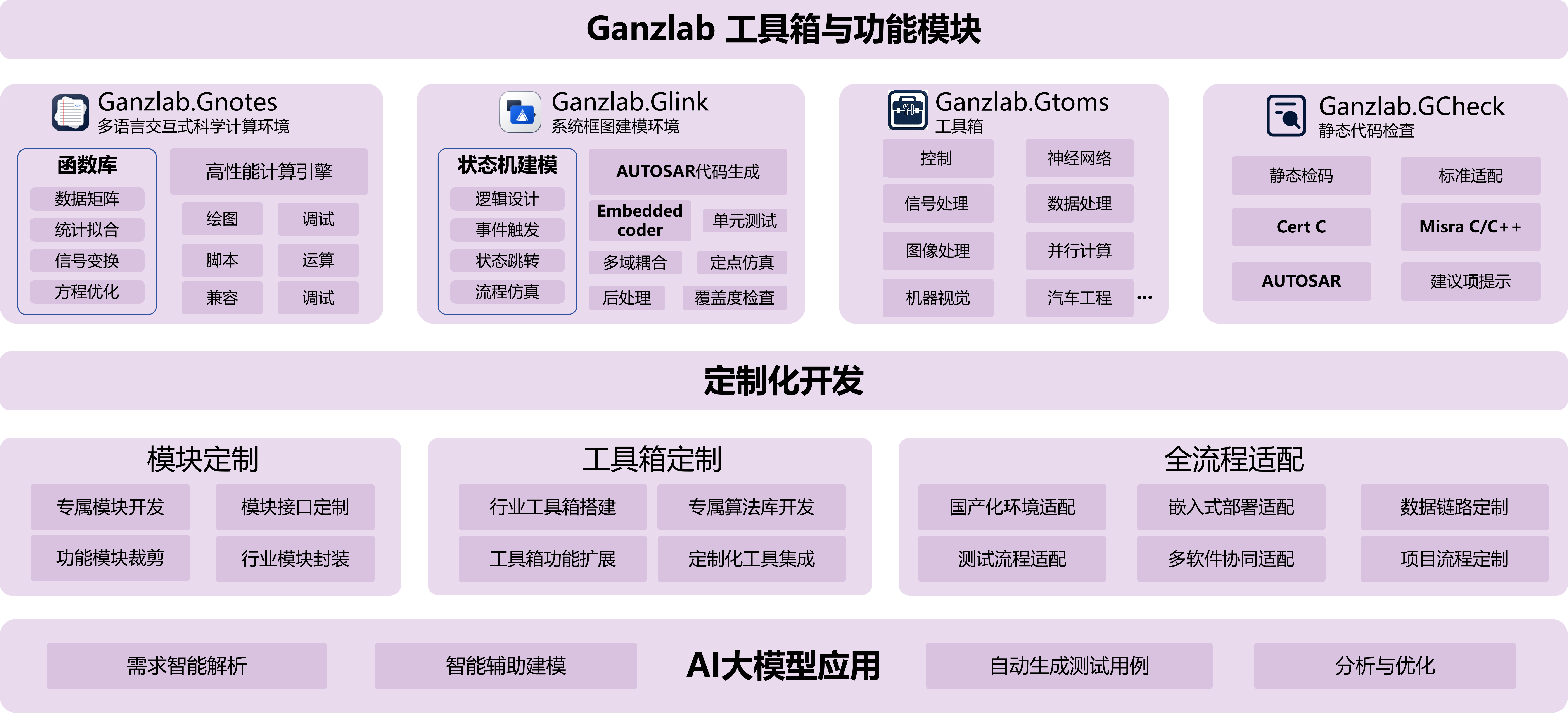 基于Ganzlab/Glink环境提供包括模型建立、仿真分析、算法开发、数据可视化、控制系统设计、信号处理、代码生成以及与硬件和其他软件工具集成等一系列工程服务。